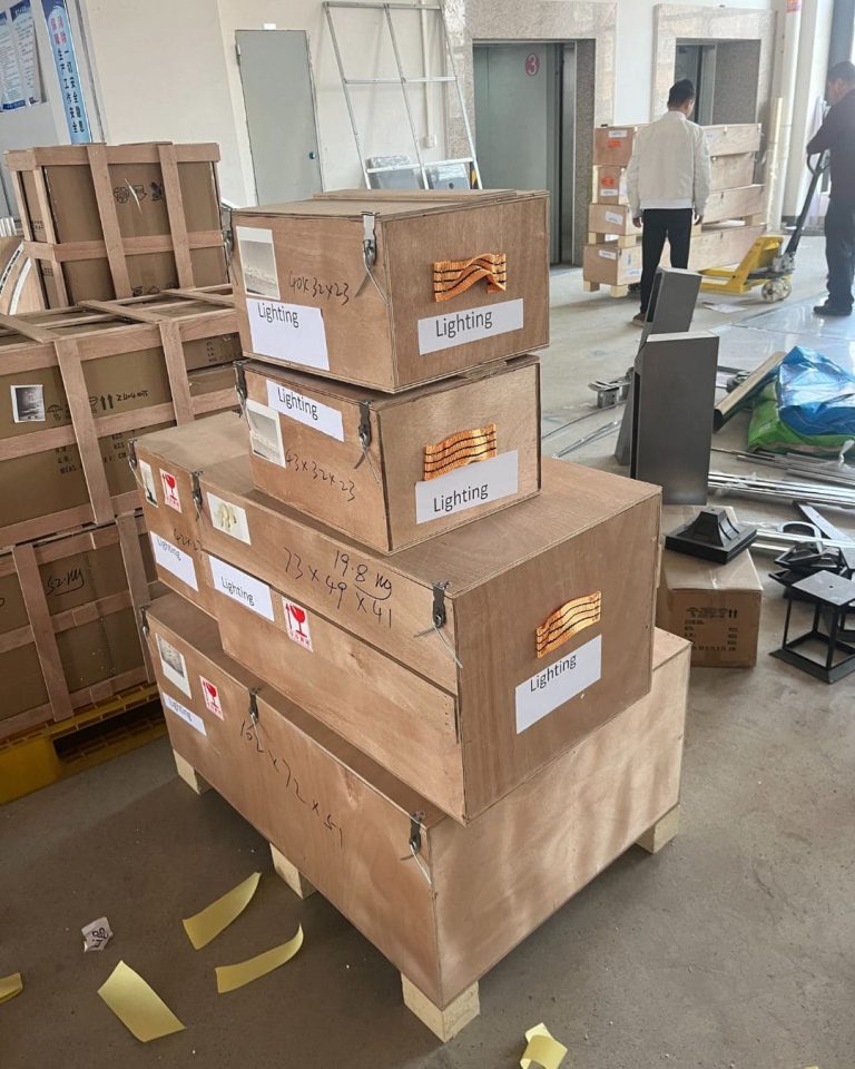 Your chandeliers travel in CNC-carved foam nests, humidity-controlled crates, and GPS-tracked air-ride containers. We absorb 100% of damage costs — rare since 2021.